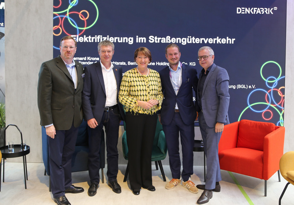 Informativer Austausch in der KRONE Denkfabrik: Unter der Moderation von Oliver Detje (Verlagsleiter, DVV Media Group) diskutierten Bernard Krone (Vorsitzender des Aufsichtsrats, Bernard Krone Holding SE & Co. KG), Hildegard Müller (Präsidentin, Verband der Automobilindustrie (VDA) e.V.), Horst Kottmeyer (Vorsitzender des Aufsichtsrats, Bundesverband Güterkraftverkehr Logistik und Entsorgung (BGL) e.V.) und Konstantin Kubenz (Geschäftsführender Gesellschafter, Kube & Kubenz Internationale Speditions- und Logistikgesellschaft mbH & Co. KG) zum Thema Elektrifizierung im Straßengüterverkehr.
